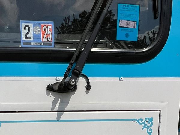 (This photo shows that Naperville Trolley has passed inspection and is valid through February, 2025. It will be re-tested by the end of February, at which time a new sticker is placed by the inspection company in the windshield.)